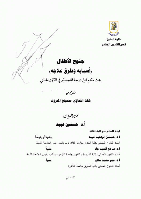 Dissertation note: اطروحة (ماجستير) - جامعة القاهرة - كلية الحقوق - قسم القانون الجنائي 2013.
