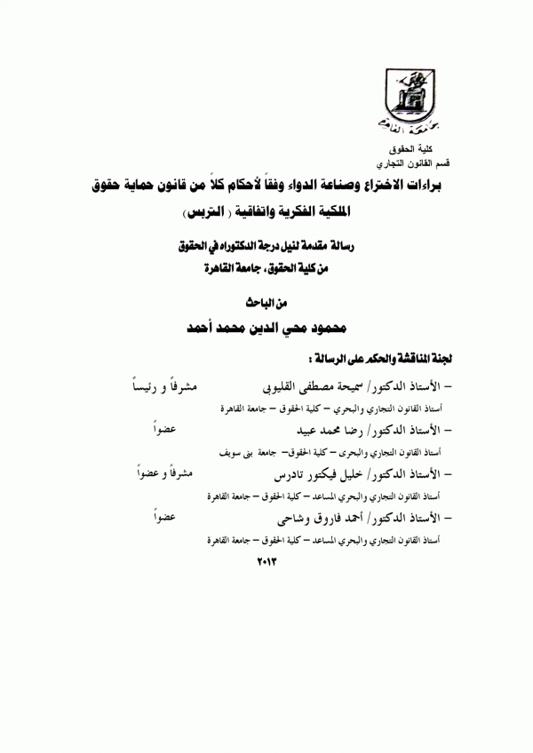Dissertation note: أطروحة (دكتوراه)- جامعة القاهرة، كلية الحقوق، قسم القانون التجاري 2012.