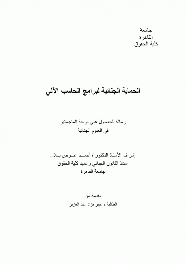 الحماية الجنائية لبرامج الحاسب الالي / عبير فؤاد عبدالعزيز by