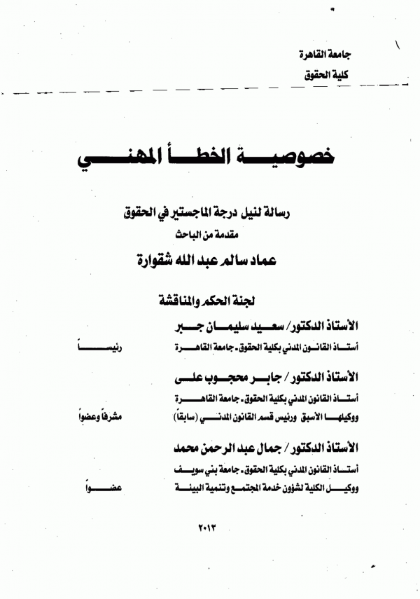 Dissertation note: أطروحة (ماجستير)-جامعة القاهرة-كلية الحقوق-قسم القانون المدني، 2013