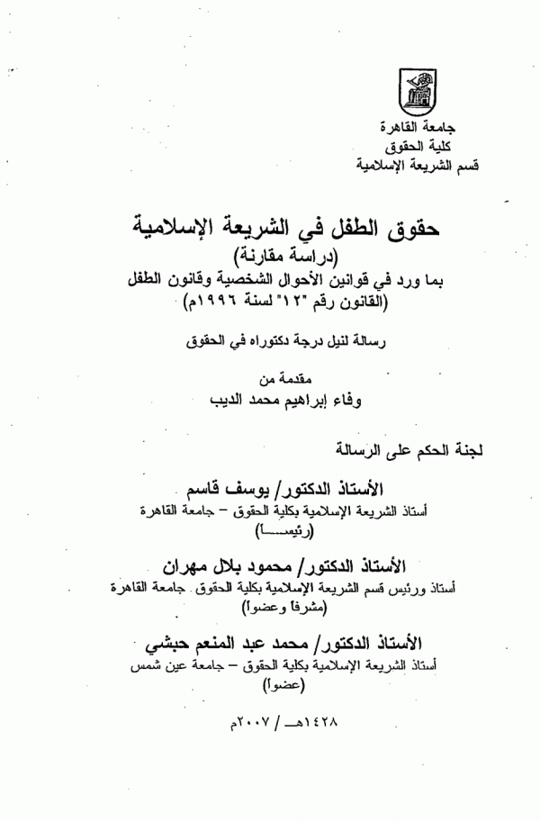 حقوق الطفل في الشريعة الاسلامية : دراسة مقارنة / وفاء إبراهيم محمد الديب by