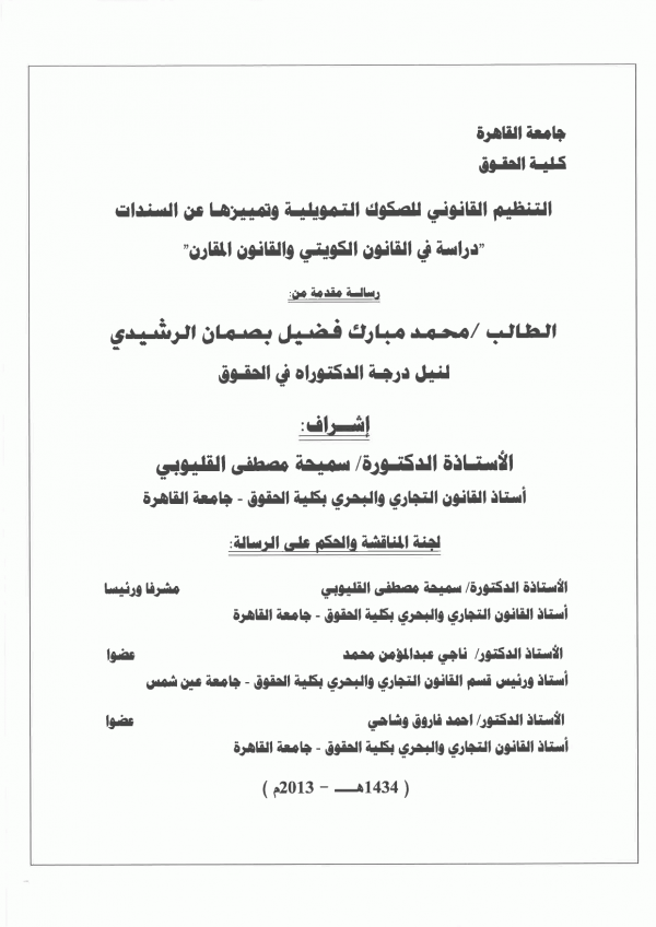 Dissertation note: أطروحة (ماجستير) - جامعة القاهرة، كلية الحقوق، قسم القانون التجاري 2013.