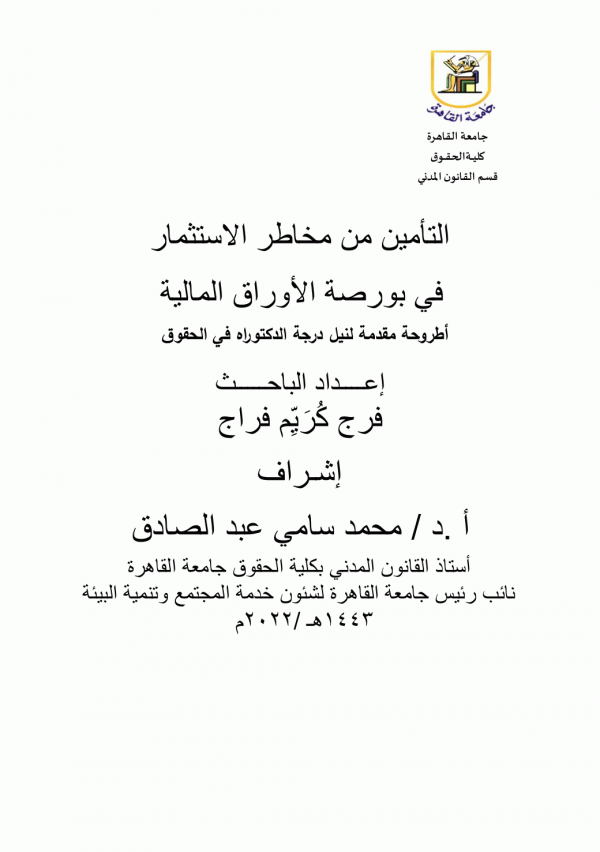 Dissertation note: أطروحة (دكتواره)- جامعة القاهرة، كلية الحقوق، قسم القانون المدني 2022.