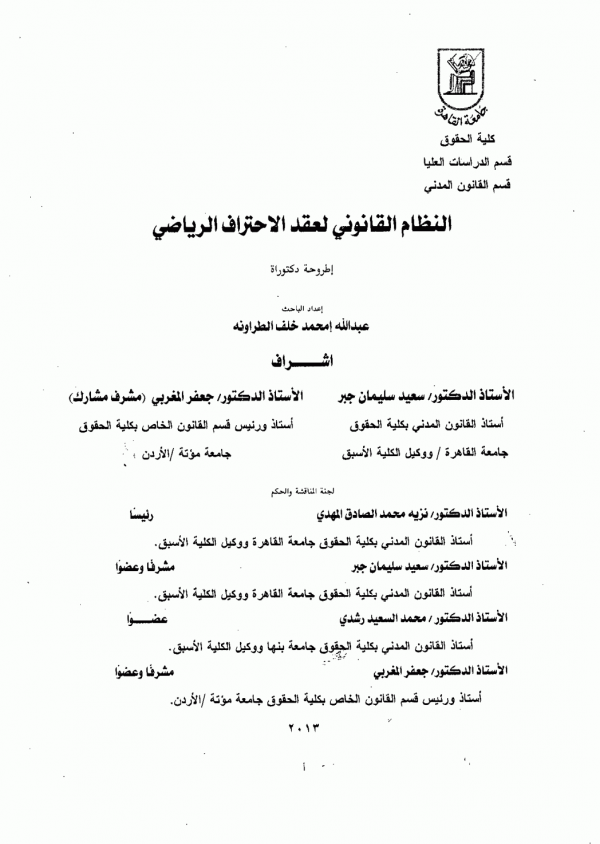 Dissertation note: اطروحة (دكتوراه) - جامعة القاهرة - كلية الحقوق - قسم القانون التجارى، 2012