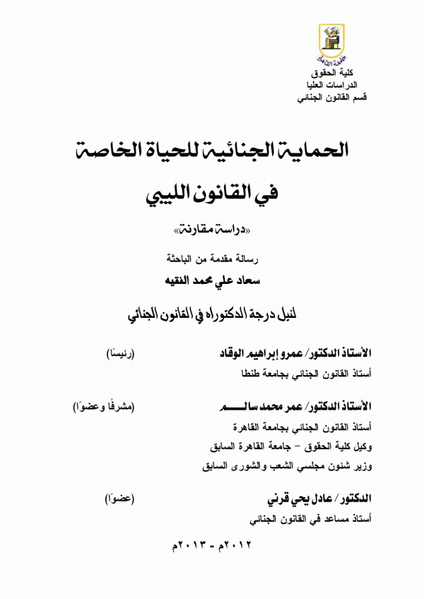 الحماية الجنائية للحياة الخاصة في القانون الليبي : دراسة مقارنة / سعاد علي محمد الفقيه by
