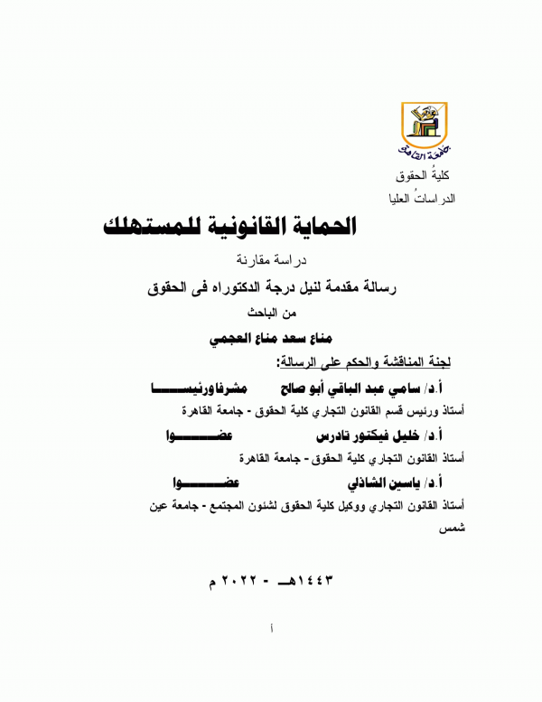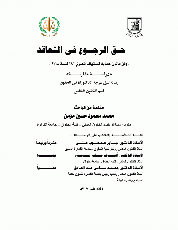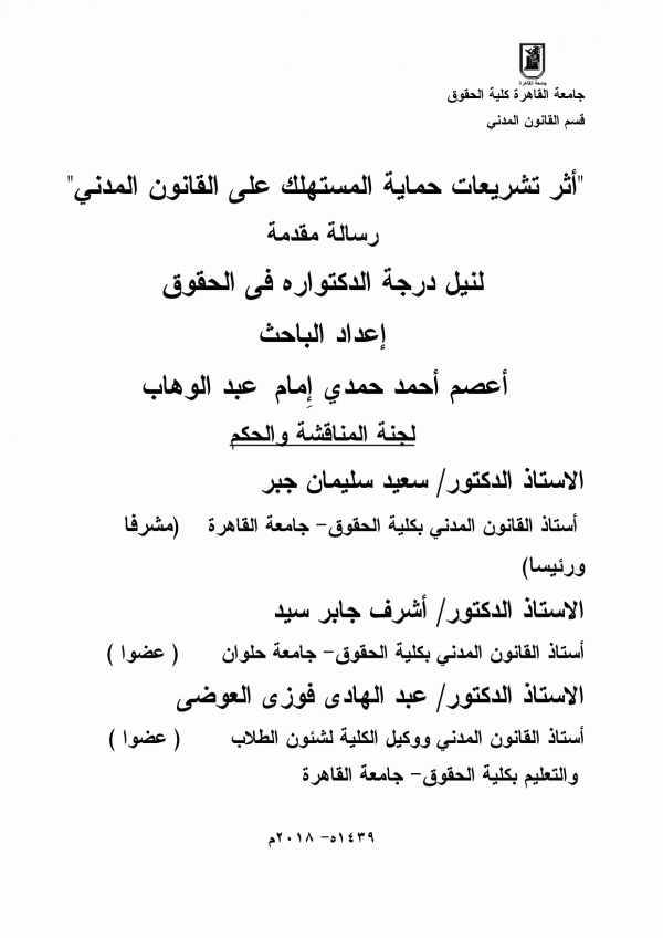 Dissertation note: اطروحة (دكتوراه) - جامعة القاهرة - كلية الحقوق - قسم القانون المدني، 2021