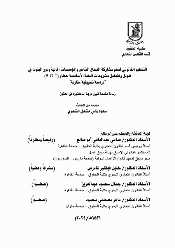 التنظيم القانوني لنظم مشاركة القطاع الخاص والمؤسسات المالية ودور البنوك في تمويل وتشغيل مشروعات البنية الأساسية بنظام (B.O.T) : دراسة تطبيقية مقارنة / إعداد سعود لماس مشعل الشمري ؛ إشراف سامي عبد الباقي أبو صالح by