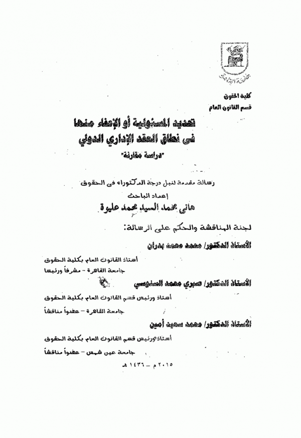 Dissertation note: أطروحة (دكتوراه) - جامعة المنصورة، كلية الحقوق، قسم القانون المدني 2016.
