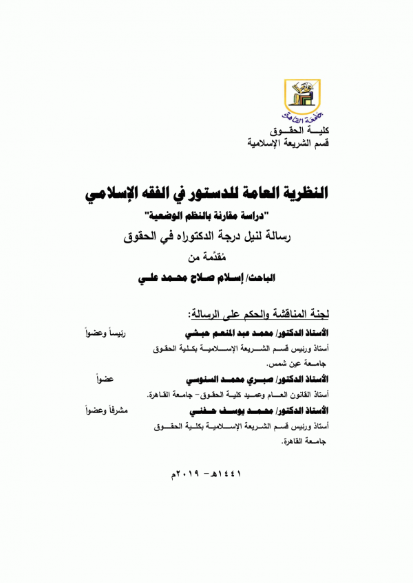 النظرية العامة للدستور فى الفقه الإسلامى : دراسة مقارنة بالنظم الوضعية / إسلام صلاح محمد على by