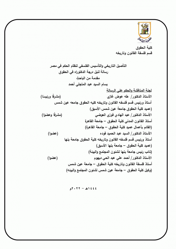 Dissertation note: أطروحة (دكتوراه)-جامعة القاهرة، كلية الحقوق، قسم فلسفة القانون وتاريخه 2022.