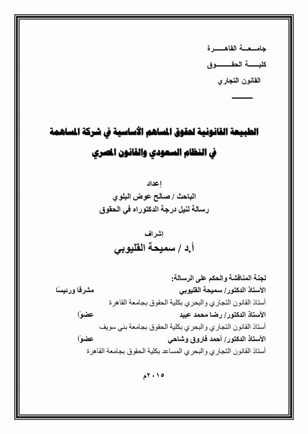 الطبيعة القانونية لحقوق المساهم الاساسية في شركة المساهمة في النظام السعودي و القانون المصري / اعداد: صالح عوض البلوى ؛ اشراف أ.د/ سميحة القليوبي by