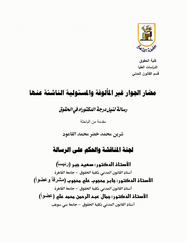 مضار الجوار غير المألوفة والمسئولية الناشئة عنها / إعداد شرين محمد خضر محمد القاعود ؛ إشراف الأستاذ الدكتور جابر محجوب علي محجوب. by