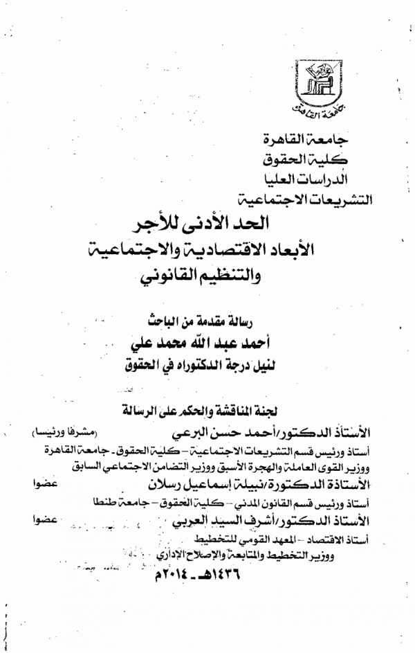 Dissertation note: اطروحة (دكتوراه) - جامعة القاهرة - كلية الحقوق - قسم التشريعات الاجتماعية، 2014