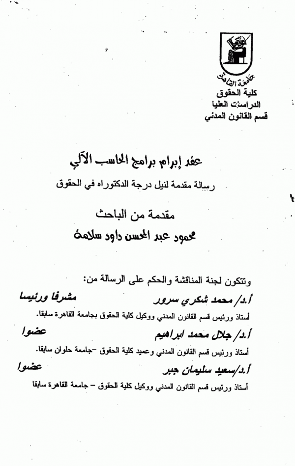 Dissertation note: اطروحة (دكتوراه) - جامعة القاهرة - كلية الحقوق - قسم القانون المدنى، 2010