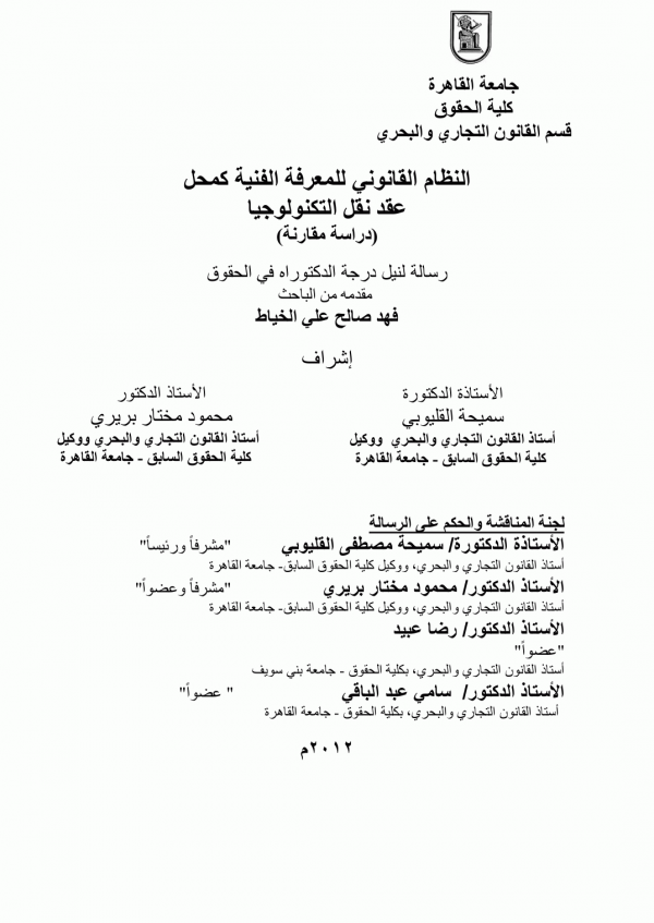 Dissertation note: اطروحة (دكتوراه) - جامعة القاهرة - كلية الحقوق - قسم القانون التجارى، 2012