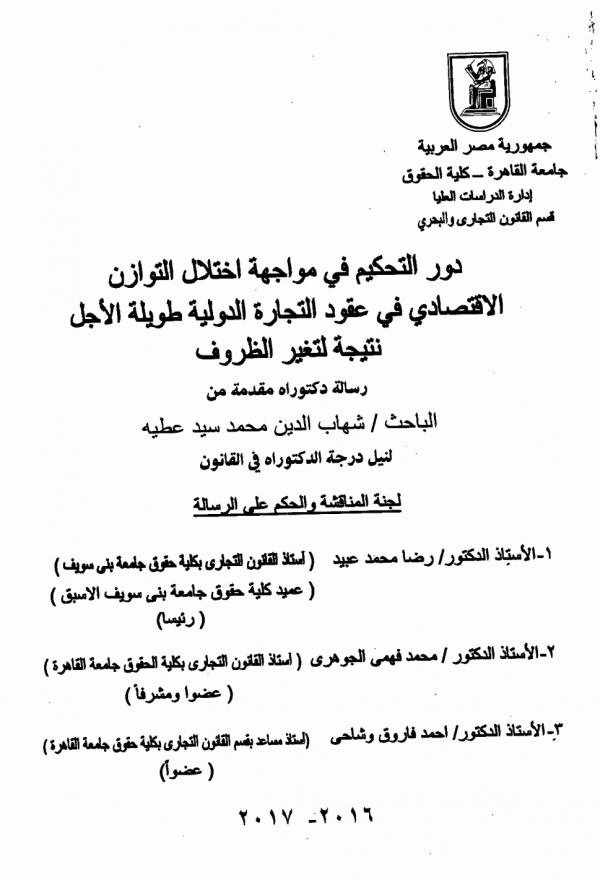 Dissertation note: اطروحة (دكتوراه) - جامعة القاهرة - كلية الحقوق - قسم القانون التجاري، 2017