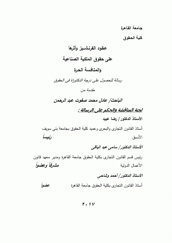 عقود الفرنشيز وأثرها على حقوق الملكية الصناعية والمنافسة الحرة / عادل محمد صفوت عبدالرحمن by